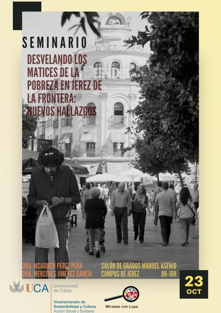 23/10 Seminario titulado “Desvelando los matices de la pobreza en Jerez de la Frontera: nuevos hallazgos”, que se celebrará el jueves 23 de octubre, de 9:00 a 10:00 horas, en el Salón de Grados Manuel Asenjo del Campus de Jerez.El encuentro será impartido por las profesoras M. Carmen Pérez Peña y Mercedes Jiménez García, investigadoras de la Universidad de Cádiz, quienes presentarán los resultados más recientes de sus estudios sobre la pobreza en el municipio jerezano.